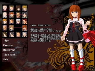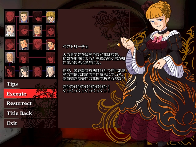 ひぐらしのなく頃に、にもありましたから、まあおなじみのものと言えるでしょう。 ※ 以下ネタバレありですのでご注意ください。 クリア後に出る Music box の中の最後の曲、「弦楽四重奏曲第一番」を何度か再生していると、こんな画面が出ます。 (クリックすると拡大します) Tips を開いて画面と同じ状態にしてください。 Tips ↓ Characters ↓ 金蔵、夏妃、絵羽、譲治、ベアトリーチェ、霧江、桜座、真理亞、紗音、郷田を Execute(金蔵は二回) の手順で隠し要素、お茶会に行けます。 ここではひぐらしのアレっぽい魔女が登場します。 そしてヒントをくれます。 それにしても、Music box 再生中にいきなり変な画面がでるから驚きましたよ。(^^;